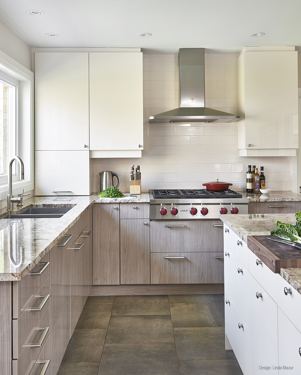 Functionality is a must, but definitely not at the expense of aesthetics. When I’m designing a kitchen and selecting finishes, I like to ensure we have several different textures within the space. In this kitchen, we have a beautiful porcelain tile floor that mimics polished concrete, adding great muted tones and textures to our kitchen. Also, the high gloss off-white cabinetry is accented with the lighter wood-grain cabinetry, reminiscent of the mid-century modern era. Finally, we added a touch of cabinetry around the fridge and wall ovens in this gorgeous wired-brushed metallic bronze finish for added interest.
